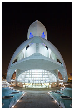 Ciudad de las Artes y de las Ciencias / City of Arts and Sciences - ValenciaDie Stadt der Künste und der Wissenschaften ist ein Science Center in Valencia. Es wurde im Juli 1996 eröffnet.Das Gebäude-Ensemble besteht aus dem: - Palau de les Arts Reina Sofía - Oper und Musikpalast mit vier Sälen auf 37.000 m² Gesamtfläche; die Baukosten betrugen 300 Mio. €. Das Opernhaus wurde am 25. Oktober 2006 eröffnet. - L'Hemisfèric - Das IMAX-3D-Kino, Planetarium und Laserium ist als sich öffnendes und schließendes Auge konstruiert worden. - L'Umbracle - Grünanlage, Parkhaus und Zugangsbereich zur C.A.C. - Museo de las Ciencias Príncipe Felipe - In diesem Wissenschaftsmuseum wird eine Auswahl von Naturgesetzen anschaulich illustriert, es ist für Kinder ab etwa 8 bis 10 Jahren geeignet. Die Architektur des Museums orientiert sich an einer Kaurischnecke. - L'Oceanogràfic - Größtes Aquarium Europas, mit einer Vielzahl von Ozeanbewohnern. Der Bau wurde noch von dem Betonschalen-Pionier Félix Candela geplant. |